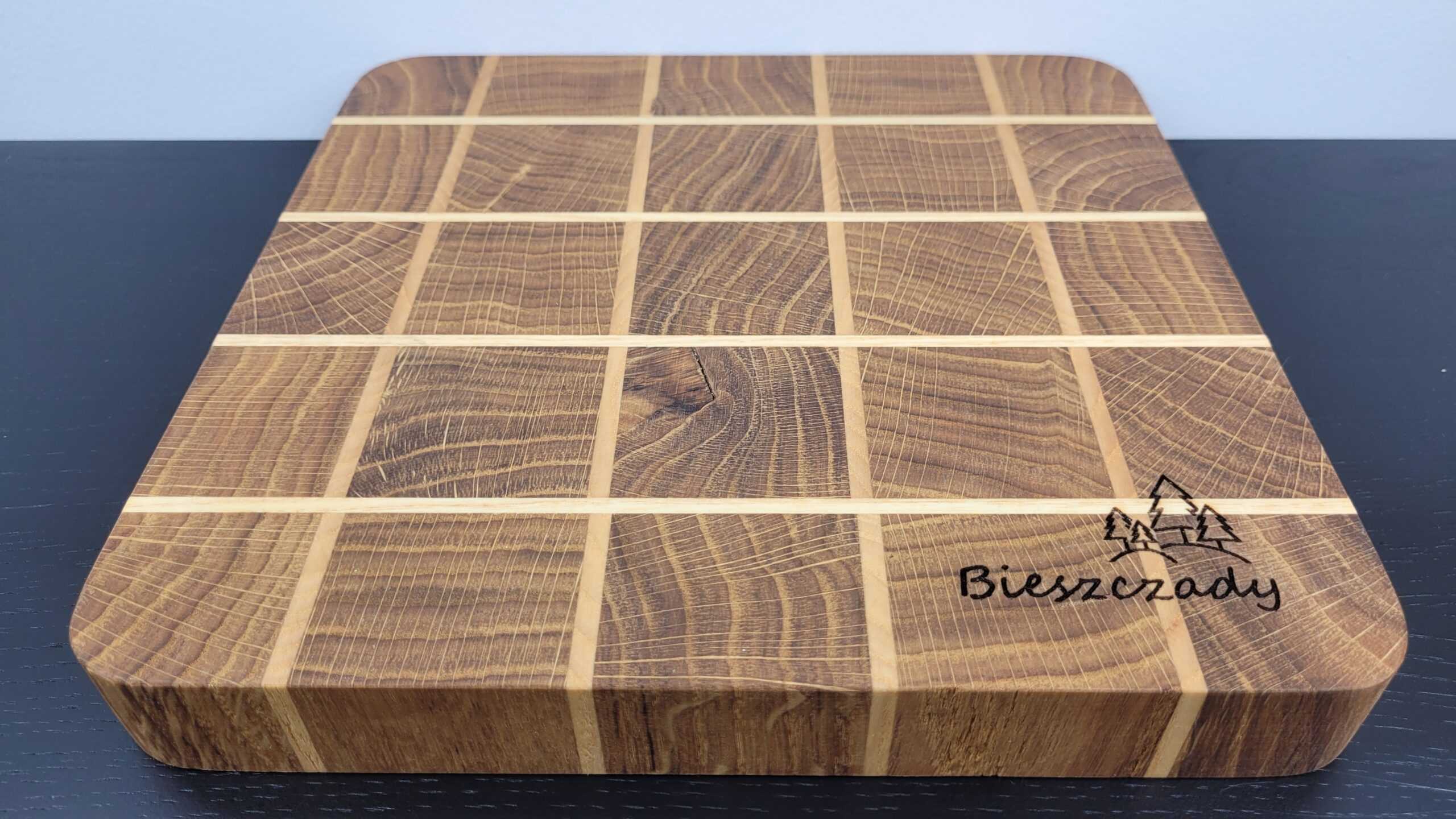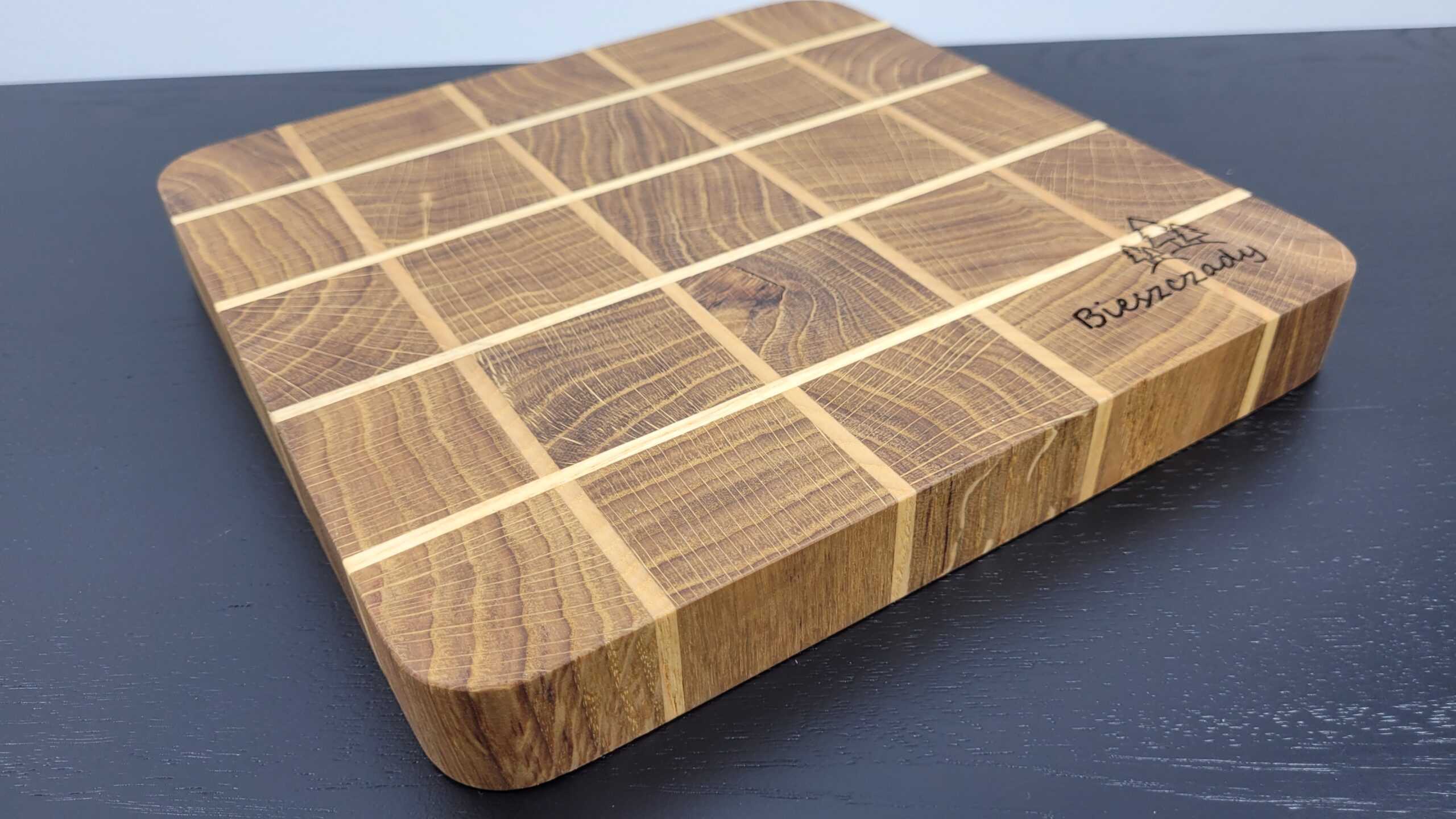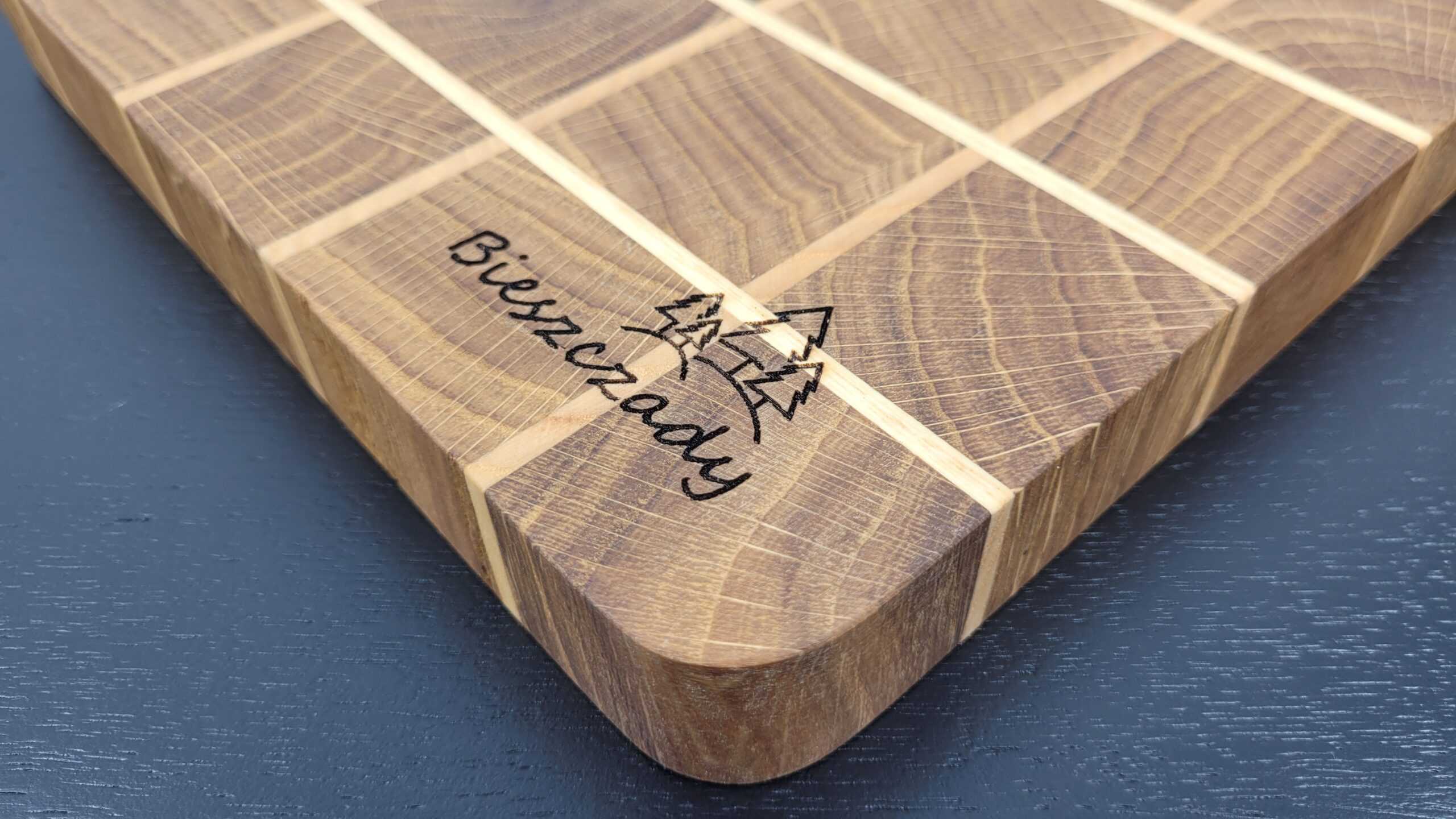 Dębowa deska do krojenia, z grawerem wykonanym laserowo, wykonana z dbałością o nietuzinkowy wygląd poprzez połączenie małych elementów, które tworzą idealną całość.