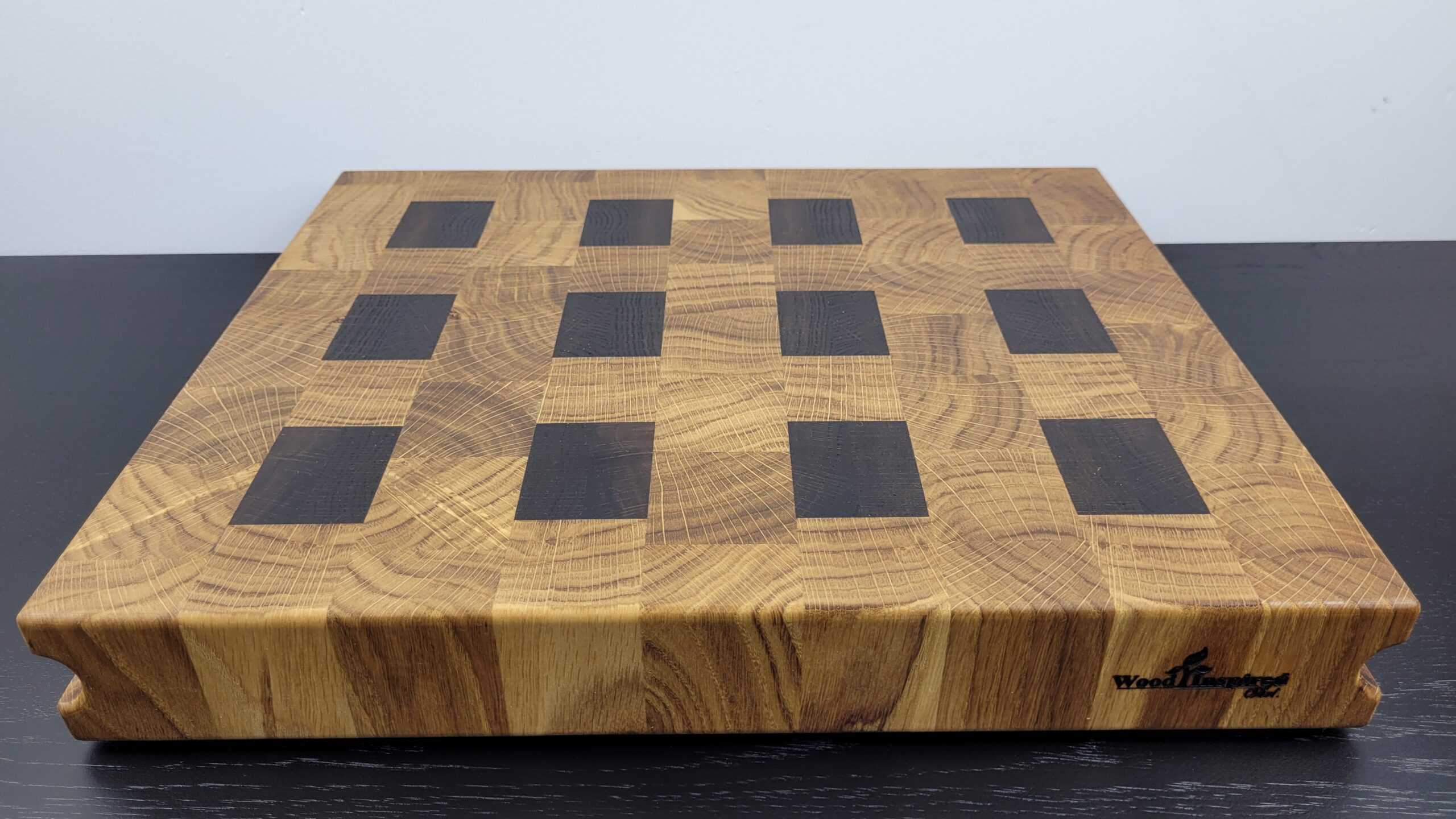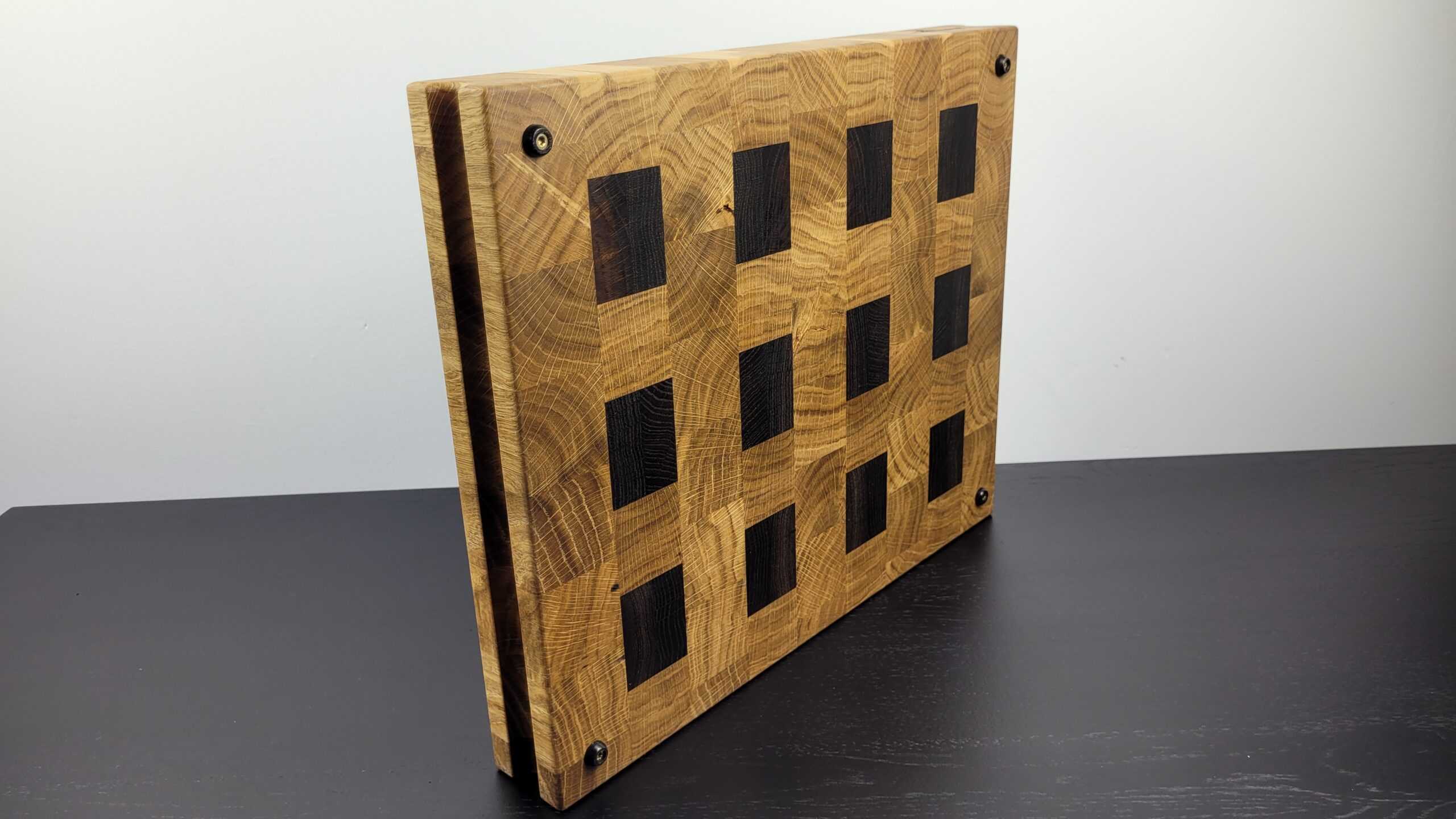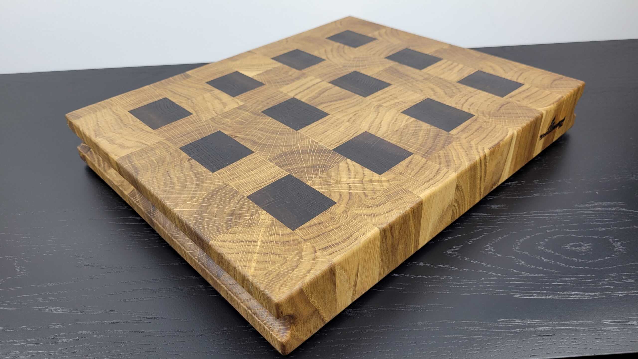 Dębowa deska do krojenia z frezowanym uchwytem, wykonana z dbałością o nietuzinkowy wygląd poprzez połączenie małych elementów, które tworzą idealną całość.