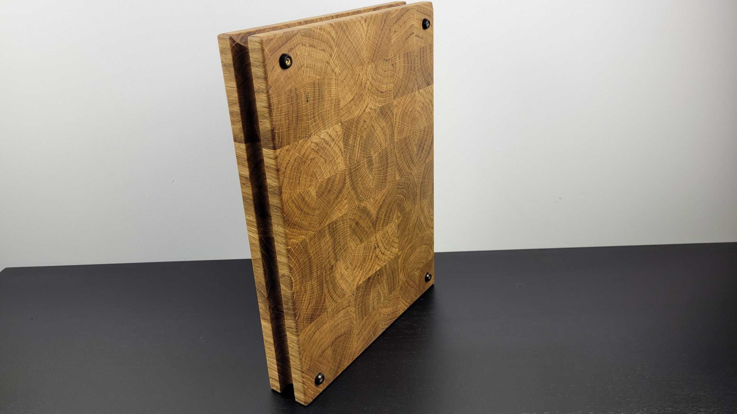 Dębowa deska do krojenia z frezowanym uchwytem, wykonana z dbałością o nietuzinkowy wygląd poprzez połączenie małych elementów, które tworzą idealną całość.